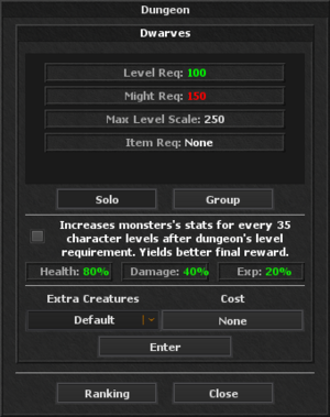 In this menu, you can see the increase for health, damage and exp for the creatures inside the dungeon. You can also see the required level, required might, max level scale and the max amount of people (when you select group). You can also opt to select the scaling option, that will further increase the creature's health, damage and exp, as well as the final reward, every 50 levels, being the max, for this dungeon (as shown in the image) which is 250, which means that for this particular dungeon, the scaling will not go past level 250. There is an option to increase the amount of creatures inside the dungeons as well, for a small fee.