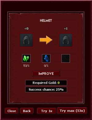 Once in this window, you can see what crystals are used to upgrade the selected slot as well as the chance to succeed the upgrade. You can also attempt multiple times in a single click by clicking the Try max button (premium account only feature) to quickly use all of your crystals.