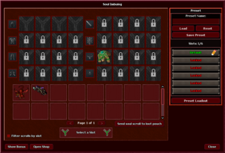 The soul scrolls are slottable a menu that has slots for different types of equipment, such as helmet, armor, weapon, etc., like shown in the image. This menu can be accessed through the Others menu, it's called Soul Imbuing Soulimbuingbutton.png. The slots will firstly appear as Locked and you will be able to unlock that slot through the usage of soul scroll unlockers, mainly obtained through Hunting Grounds.