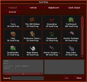 If there's a soul scroll that's been hard for you to get or to expensive to buy from other players, you can grind up for Soul FragmentsSoulfragment.gif to get any scroll of your choosing. Soul Fragments are mainly obtained through doing higher difficulty Daily Bosses or through the Roulette. You can access the soul fragment shop through the soul imbuing menu or by using the soul fragments.