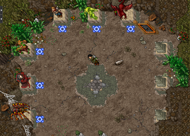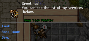 From mainland city's temple, head south and enter the Creatures/Quests teleport just, as indicated in the image to the right. Once inside, go up both stairs and you will immediately find the first tasker NPC: Snip Task Master. Talking to him will open a little menu. Simply choose the Task option to get started.