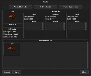 When choosing the tasks you want to do, there will be three options for you to choose from: Easy, Medium and Hard. Each difficulty represents the amount of kills you will have to perform for said task, with harder difficulties giving more experience and items in return if compared to easier difficulties.