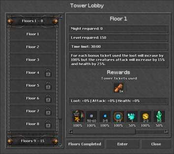 The tower arena is divided by floors, the next one being more difficult and more rewarding than the previous one. You can only start the tower arena at anytime as long as you have the entry cost, the Tower TicketTowerticket.png. You can obtain this ticket through Juarez, for loyalty points or as a rare loot from bosses.